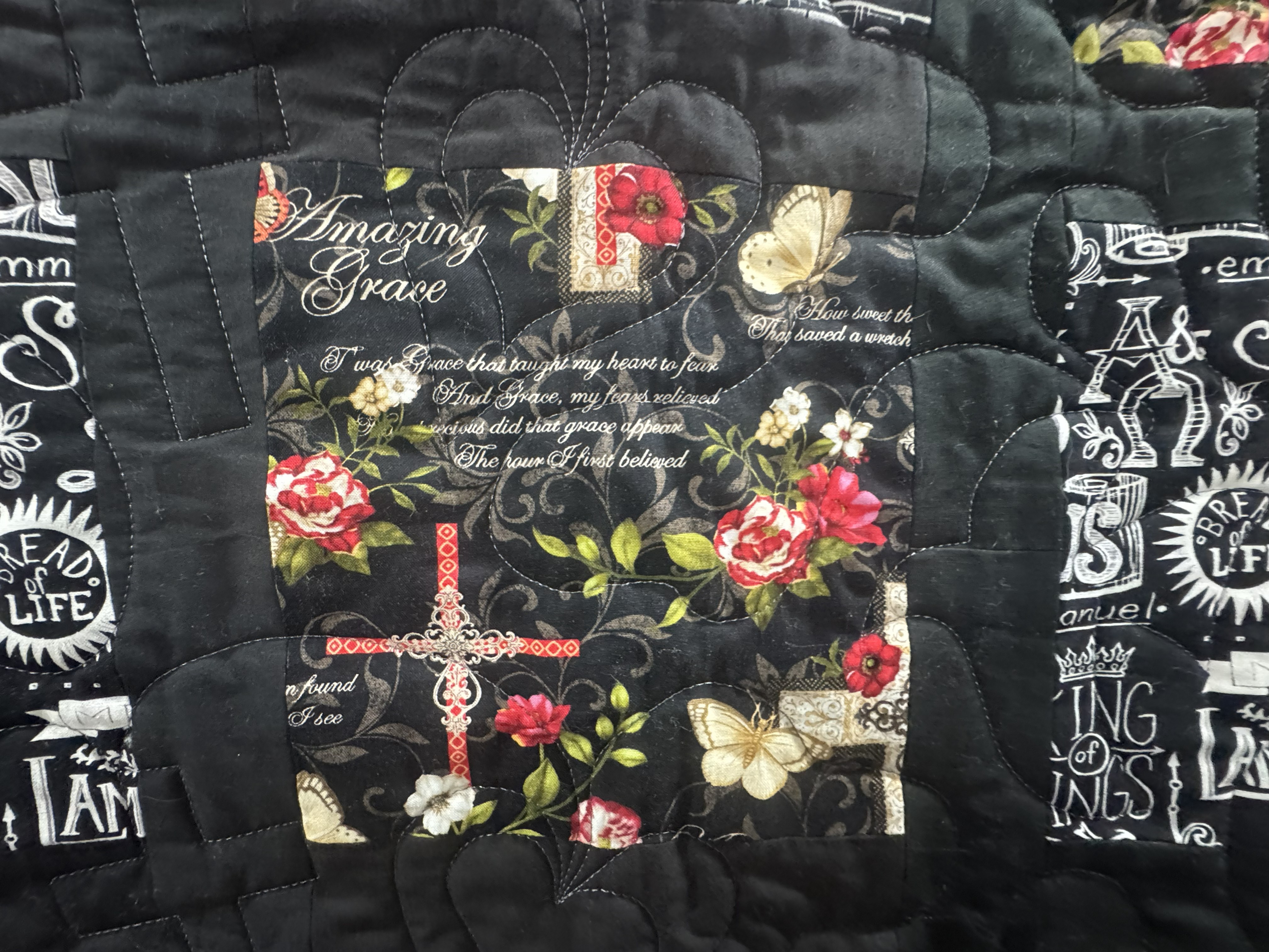 Custom Quilts You Tube Video Slideshow of Quilts & Pillows http://www.youtube.com/watch?v=LrT5TbAqKjs Pillows, Quilts, and Baby Blankets made the 'old fashioned way' JESUS Quilt with individual Panels, colorful, black background and back Panel Queen Topper Size