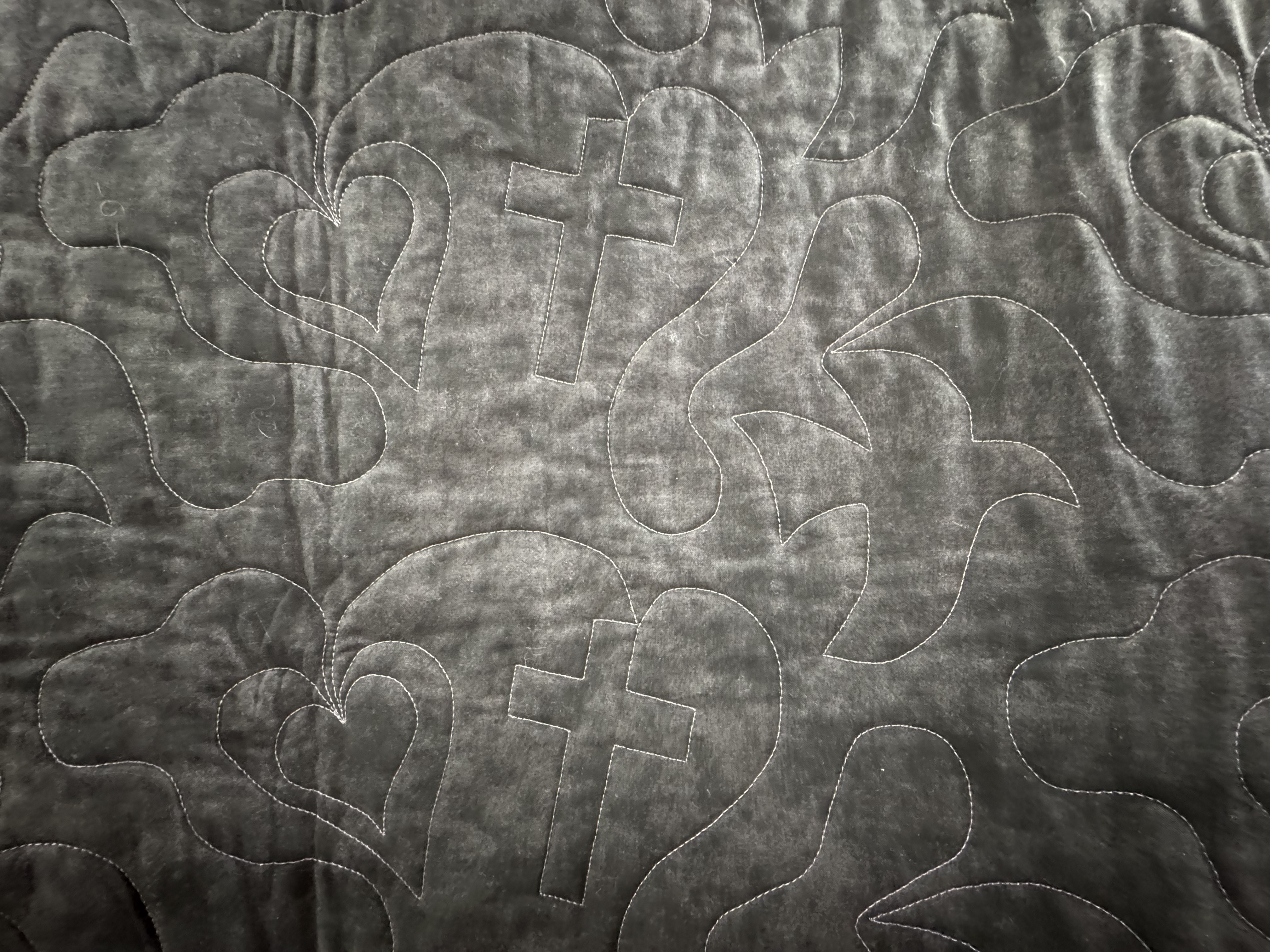 Quilt has a pattern of Doves, Hearts and Crosses holding the top to bottom.