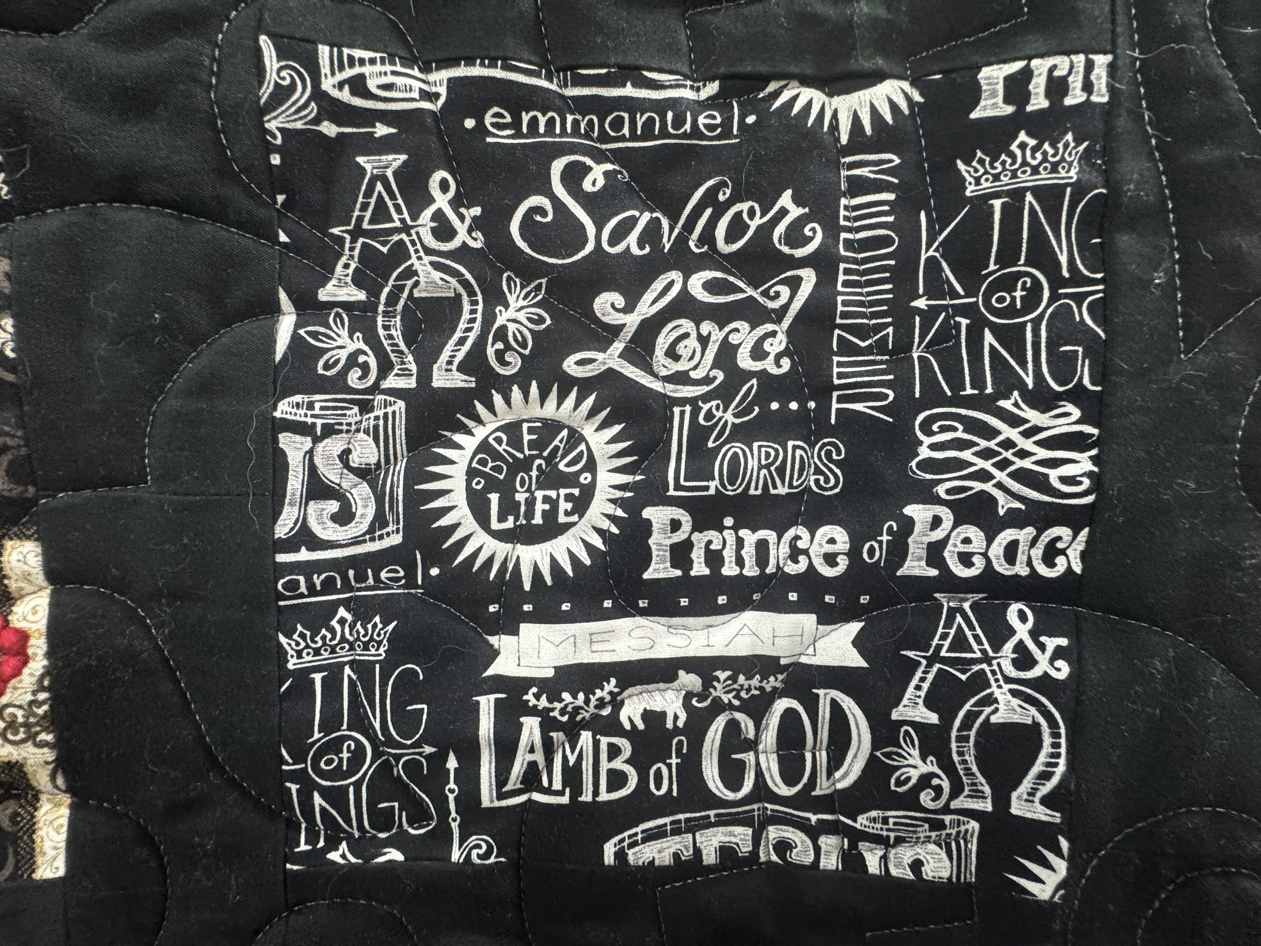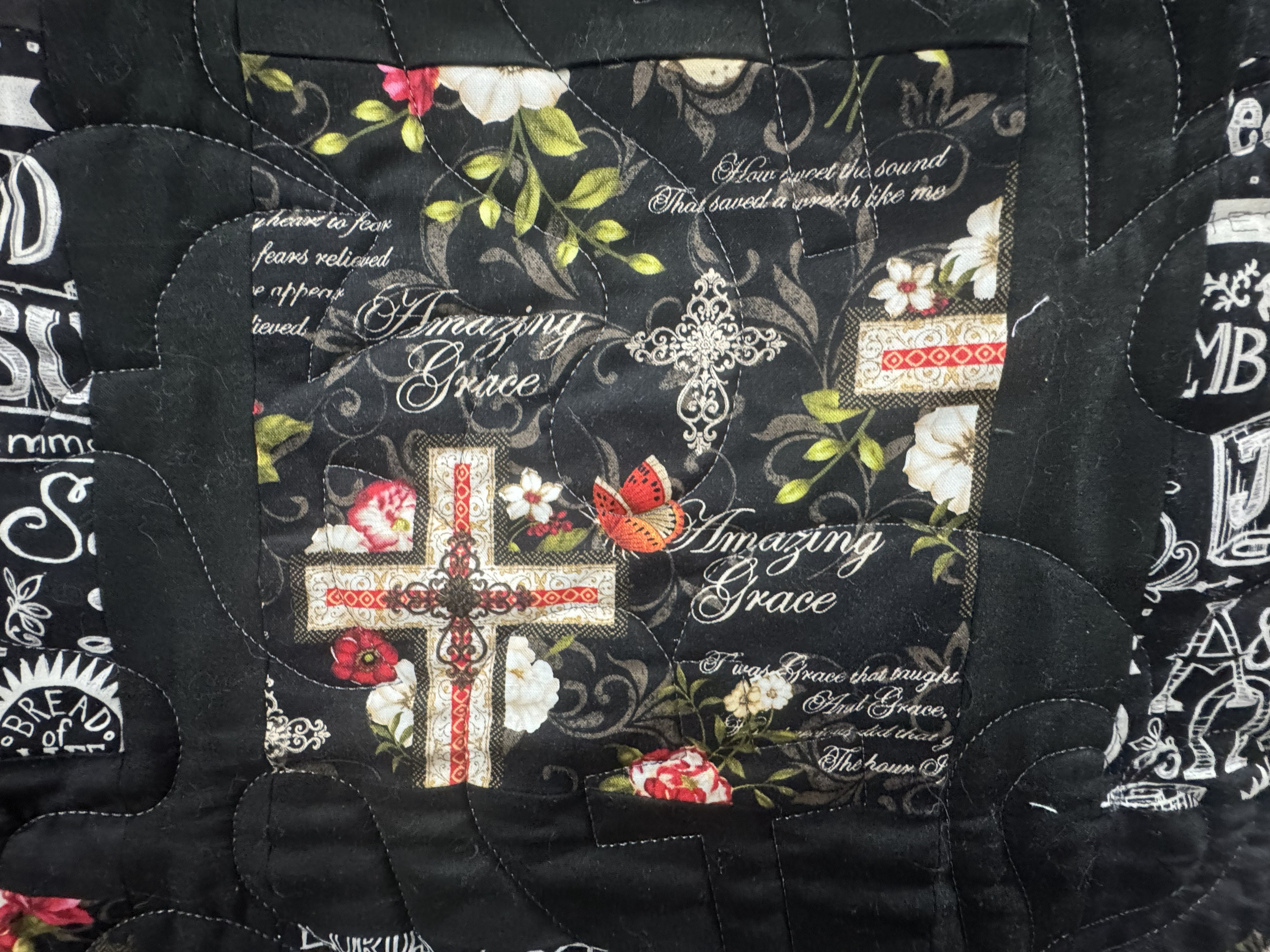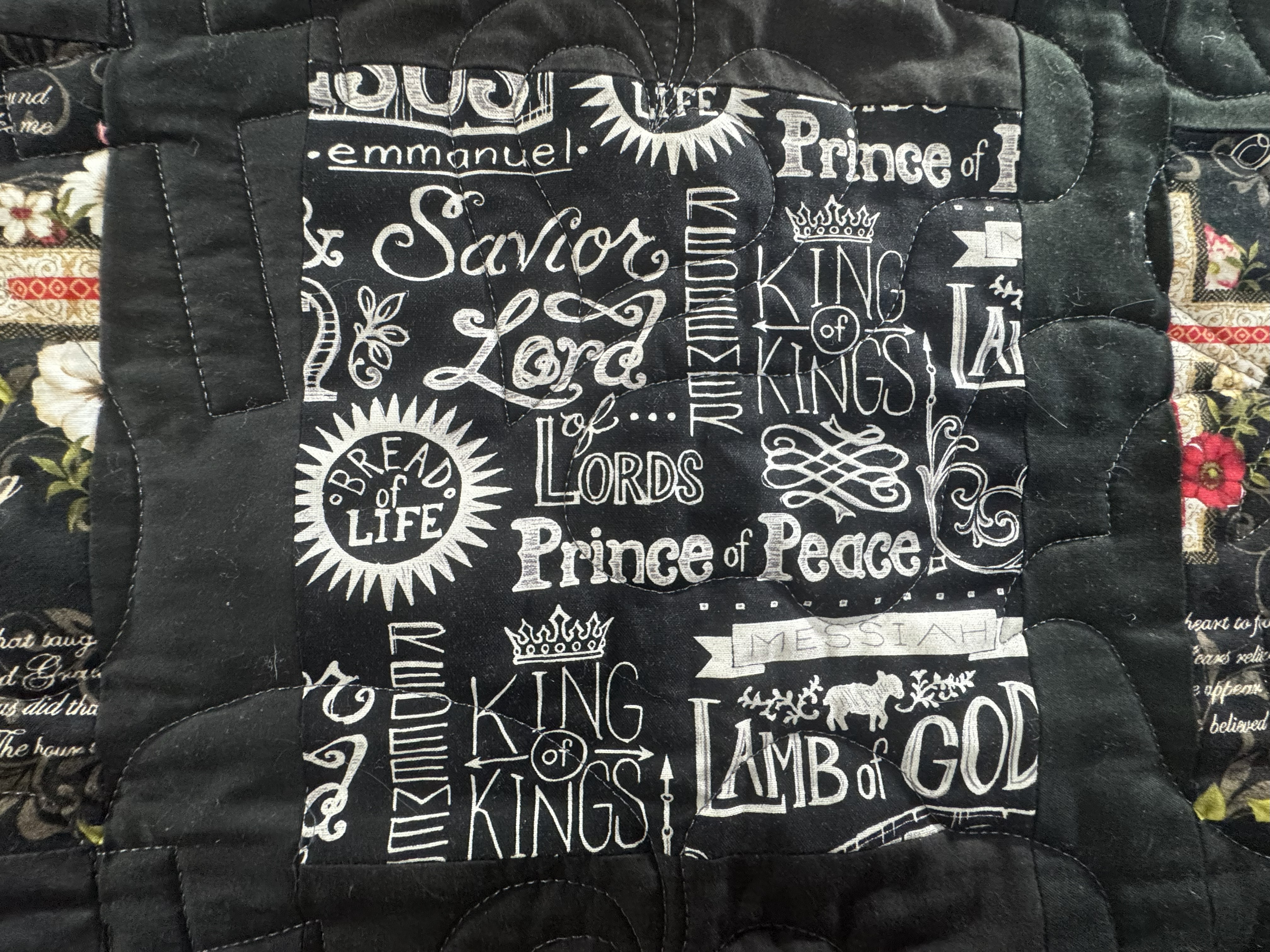 Custom Quilts You Tube Video Slideshow of Quilts & Pillows http://www.youtube.com/watch?v=LrT5TbAqKjs Pillows, Quilts, and Baby Blankets made the 'old fashioned way' JESUS Quilt with individual Panels, colorful, black background and back Panel Queen Topper Size
